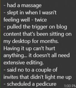 - Deciding to take a solo hike, get a massage, or just sleep in without guilt.